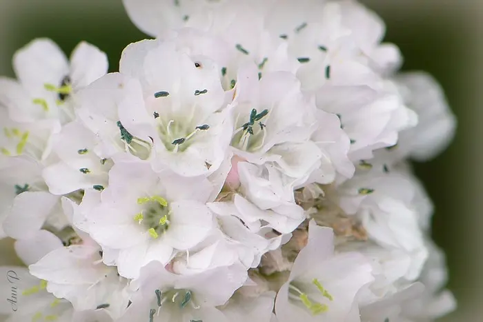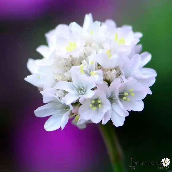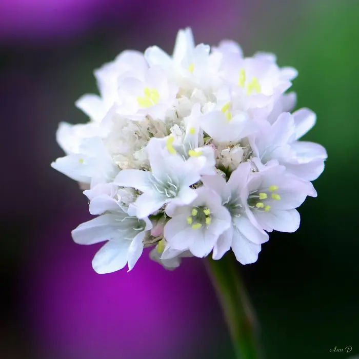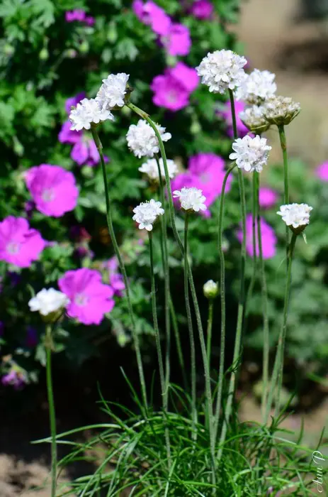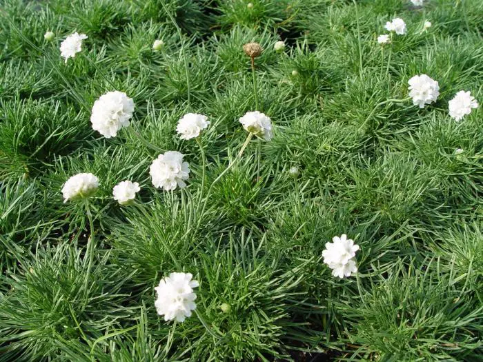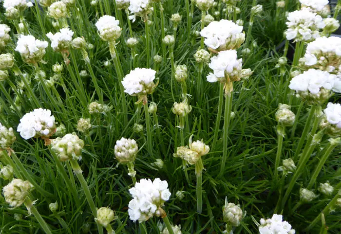 Armeria maritima 'Alba' forme des touffes de feuilles vert foncé ressemblant à de l’herbe et fleurit abondamment avec des fleurs blanches sphériques sur des tiges robustes.