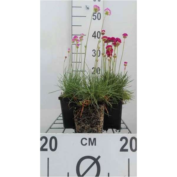 Armeria maritima 'Splendens Perfecta' forme des touffes herbeuses ressemblant à de l’herbe de feuilles vert foncé et fleurit abondamment avec des fleurs sphériques rose foncé sur des tiges robustes.