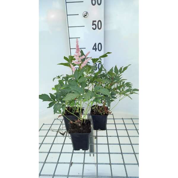 Astilbe japonica 'Fleur de pêcher' fleurit avec des fleurs rose pâle à blanc rosé, rassemblées en panicules courtes, bien ramifiées et denses.