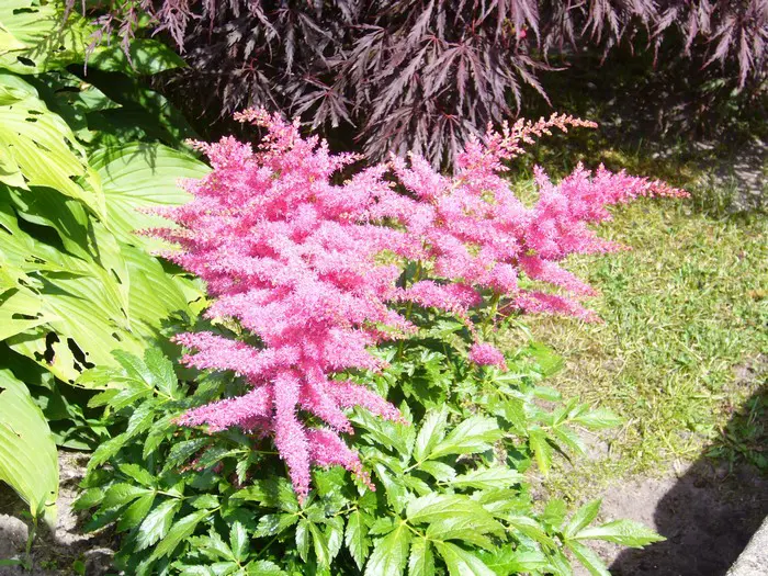 Astilbe 'YOUNIQUE Cerise' fleurit avec de grandes fleurs parfumées en forme de panache violette-rose.