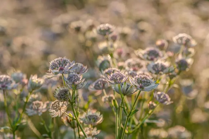Astrantia major 'Rosa Lee' fleurit avec des fleurs argenté-rosées finement structurées et des bractées.