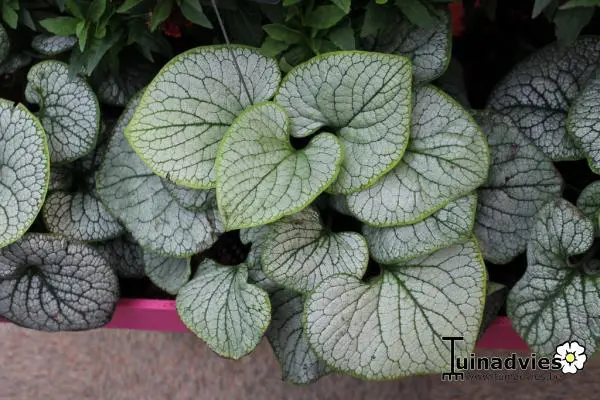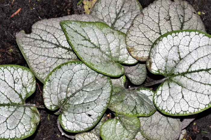Brunnera macrophylla 'Silver Heart' est un couvert-sol touffu avec de grandes feuilles rondes et argentées simples, veinées de vert et de fines bordures vertes.