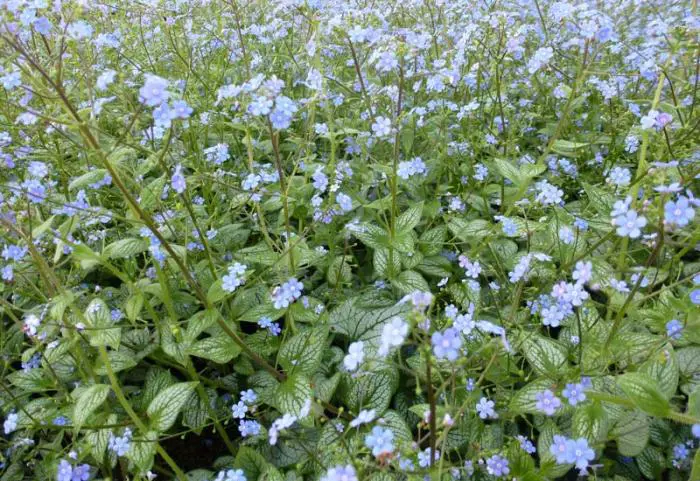 Fleurs avec un nuage de petites fleurs bleues sur de fines tiges. Les fleurs ressemblent beaucoup à celles du myosotis commun ainsi qu’à celles de la langue vernaline américaine ou de l’Omphalodes.