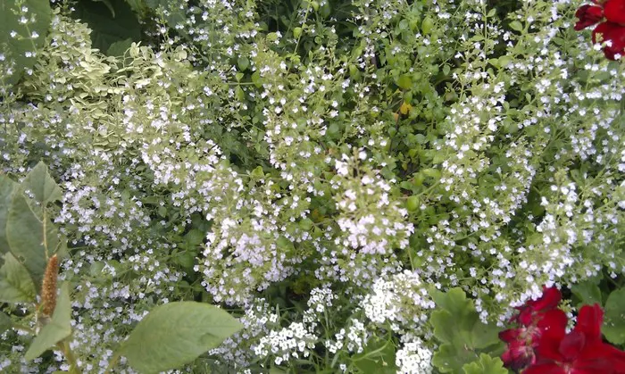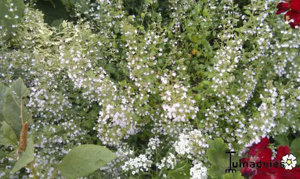 Elle forme une plante basse et touffuïe qui fleurit abondamment avec des fleurs blanches plus grandes.