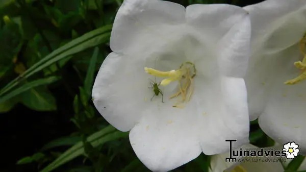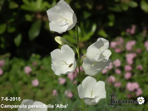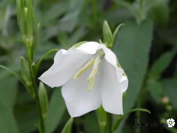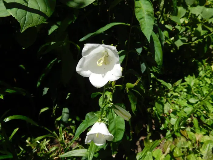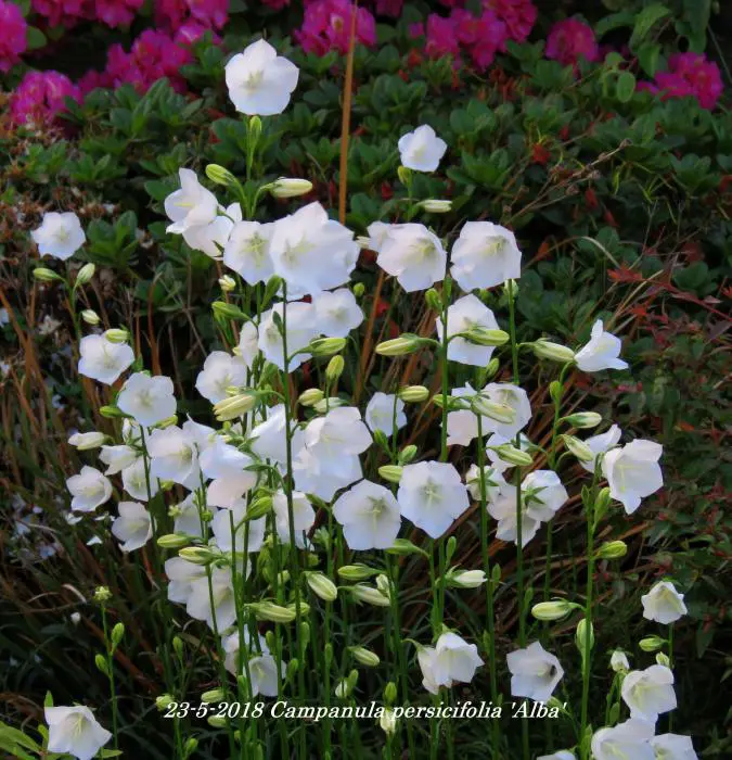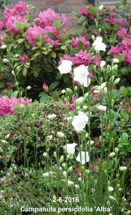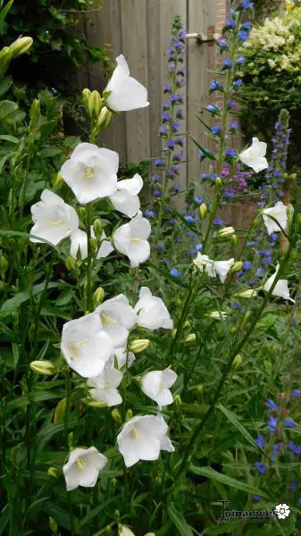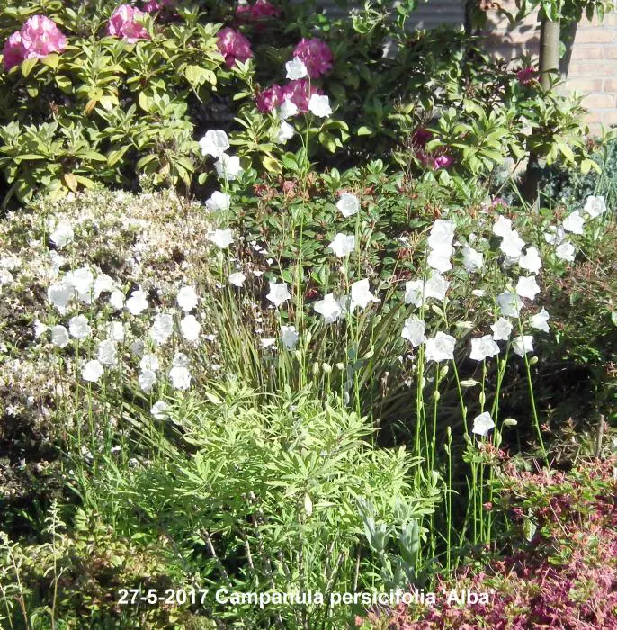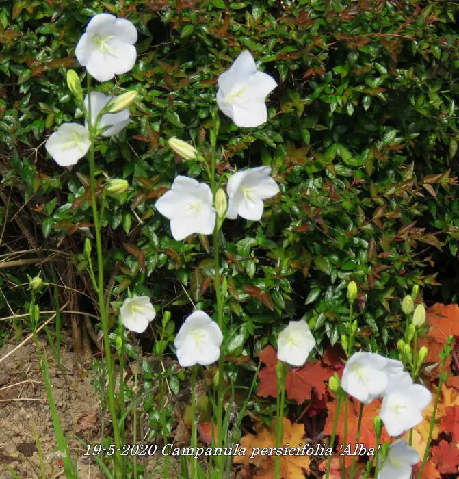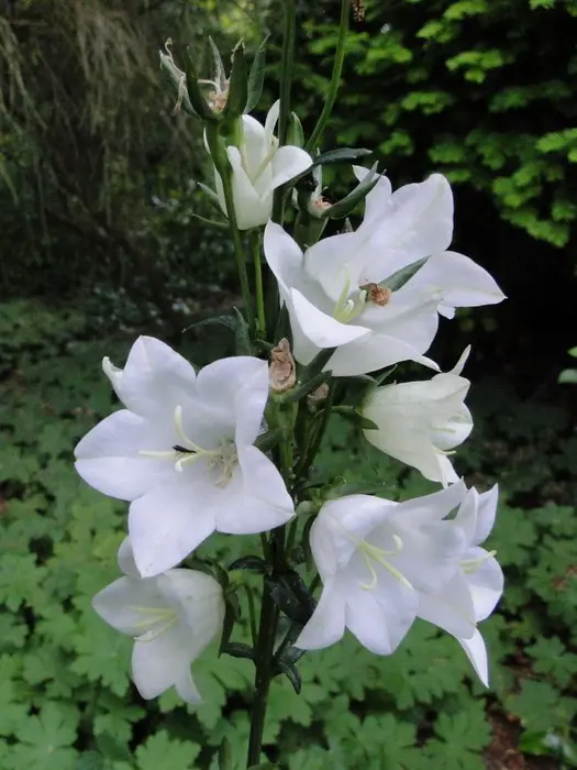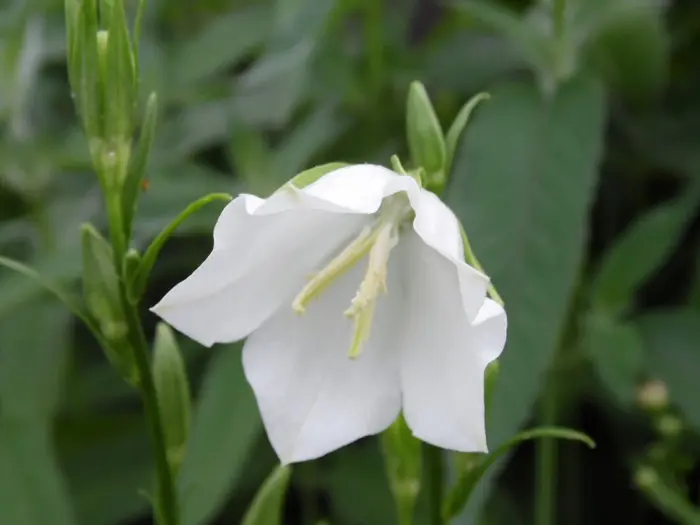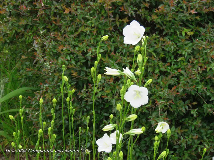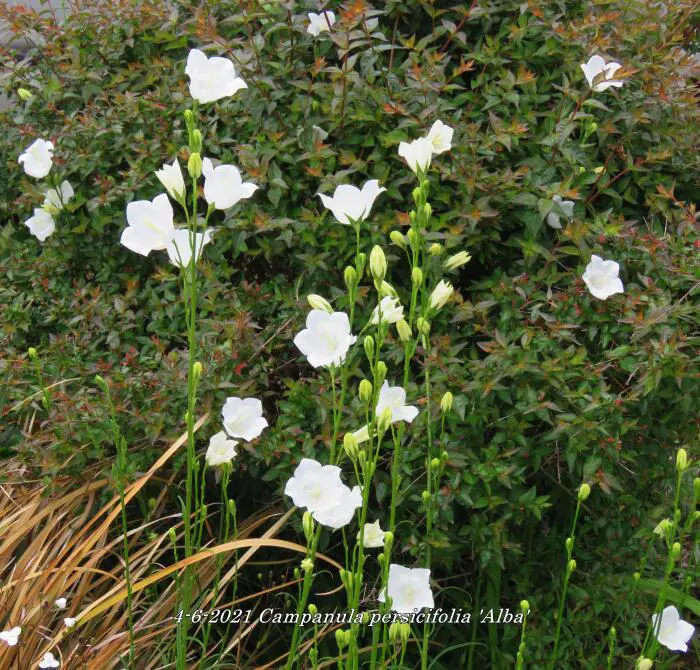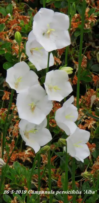Campanula persicifolia 'Alba' fleurit pendant près de 3 mois avec plusieurs fleurs blanches en forme de cloche sur une longue tige presque nue.