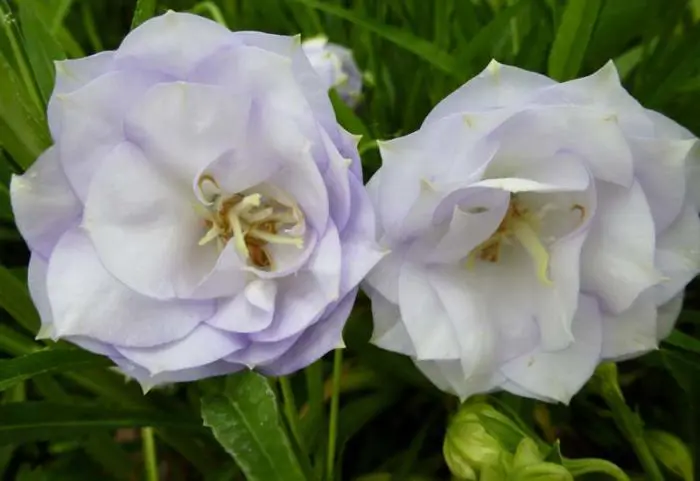 Campanula persicifolia 'La Belle' fleurit sur des tiges longues et robustes à branches clairsemées, avec deux grandes cloches violet-bleu.