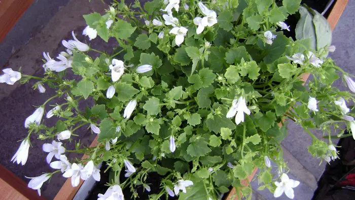 La Campanula portenschlagiana « Ice White » fleurit avec des fleurs bleu-blanchâtres en forme d’étoile.