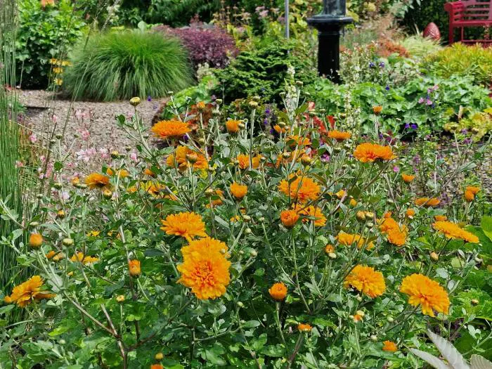 Le chrysanthème 'Dixter Orange' est une plante touffue et herbacée, avec une abondance de fleurs doubles orange fumées en automne.