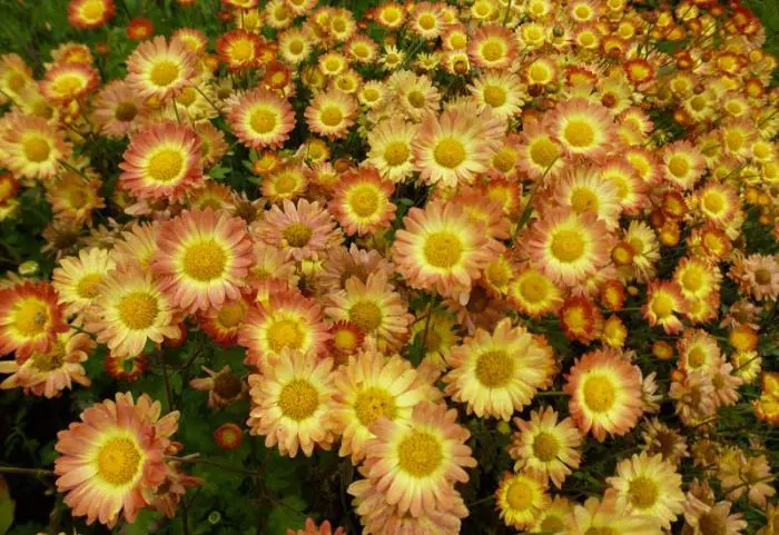 Chrysanthemum indicum 'Dernier Soleil' est une plante touffue et herbacée avec une abondance de fleurs jaunes et, de l’orange cuivré au saumon à l’extérieur, un cœur orangé-jaune au centre.