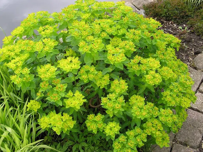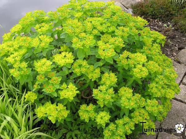 Euphorbia epithymoides 'Midas' pousse largement et constitue donc un bon couvert végétal avec des fleurs jaunâtre verdâtres dont les bractées jaune doré vif sont plus larges que chez l’espèce.