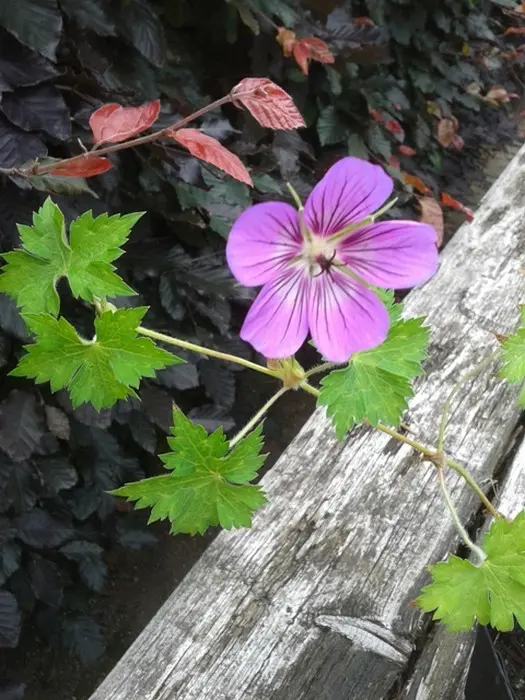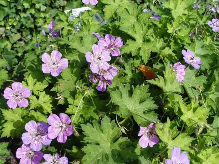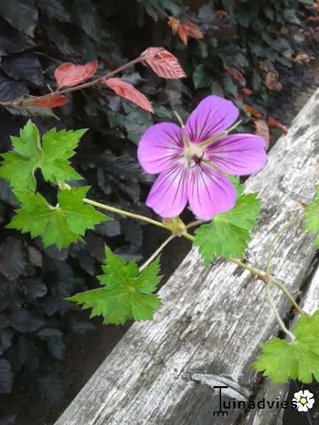 Geranium 'Havana Blues' présente un habit bas et étendu avec de longues vrilles non enracinées (50 cm) et des feuilles vertes lobulées, bronze en automne.