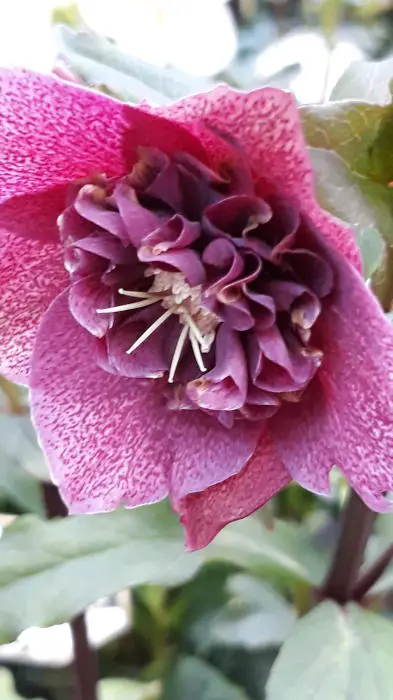 Helleborus × hybridus 'Mara' (série Winter Angels) fleurit avec des fleurs semi-doubles, tachetées de violet-rouge.