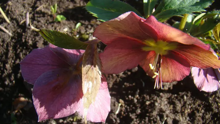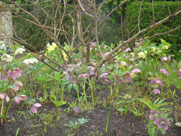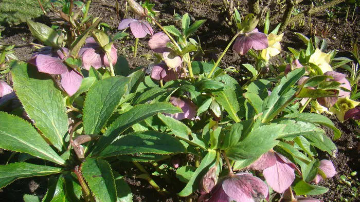 Helleborus x hybridus est un hybride coloré avec un grand nombre de cultivars fleurissant avec des fleurs en forme de coupe dans diverses couleurs de rose doux, rose, rose violacé, magenta, rouge-pourpre, abricot, jaune verdâtre, vert doux, blanc, blanc crème ou parfois tacheté à l’intérieur.