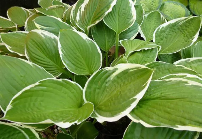 Hosta 'Carol' forme des feuilles vertes en forme de cœur avec un bord blanc. Ça ressemble beaucoup à Hosta 'Francee'.