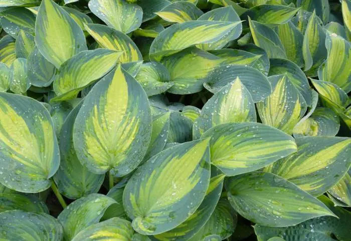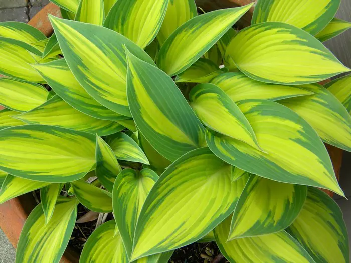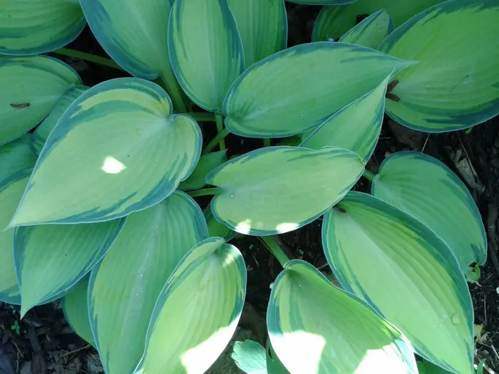 Hosta June a des feuilles verd-jaune avec des bords bleu-vert.