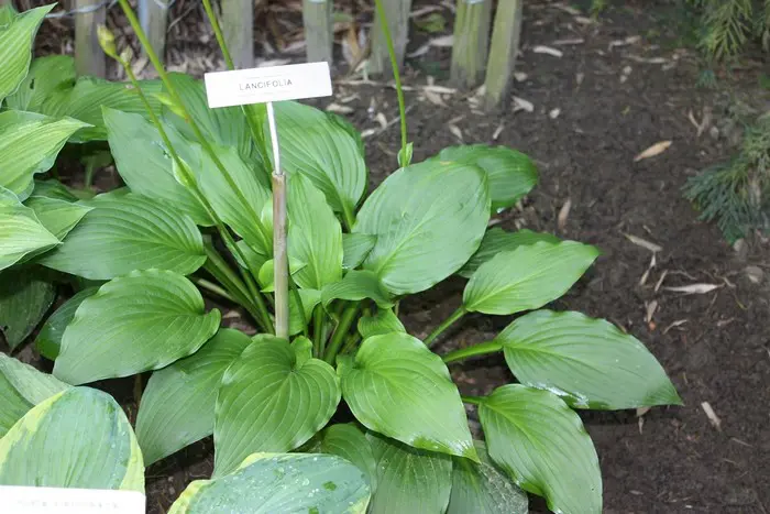 Hosta Lancifolia possède des feuilles vertes brillantes et allongées et fleurit abondamment avec des fleurs de couleur lilas.