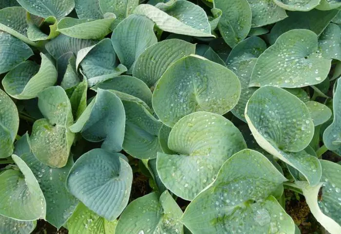 Hosta 'Ryan’s Big One' a des feuilles bleu-vert en forme de cœur plissées.
