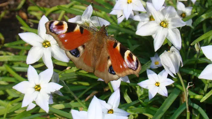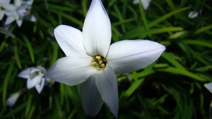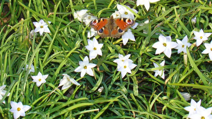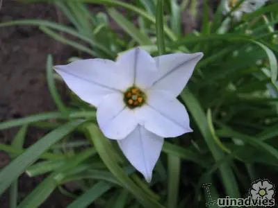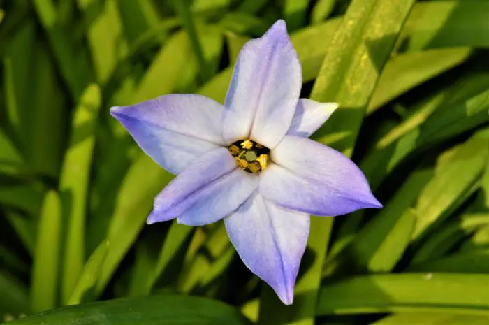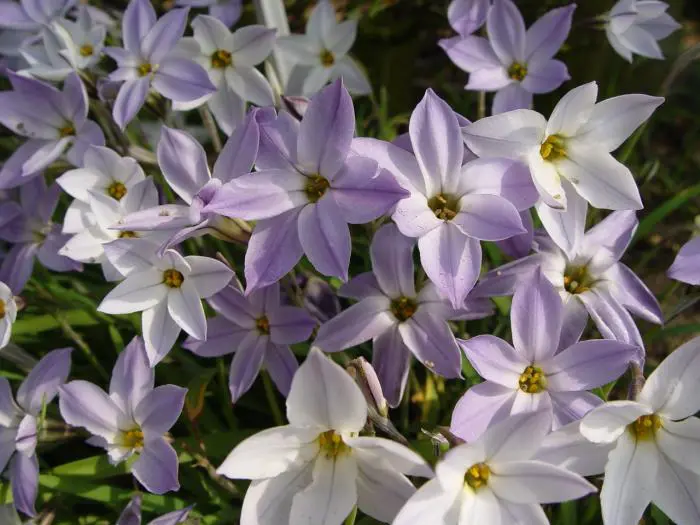 Des fleurs en forme d’étoile bleu lilas et des étamines jaunes avec des feuilles persistantes semblables à de l’herbe qui sont tendres. Les fleurs deviennent ensuite blanches.