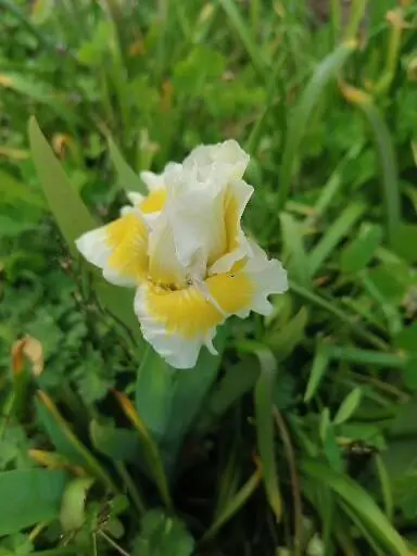 La fleur présente des bords ondulés, des pétales blancs et des sépales blancs avec des barbes jaune vif et bleu clair.