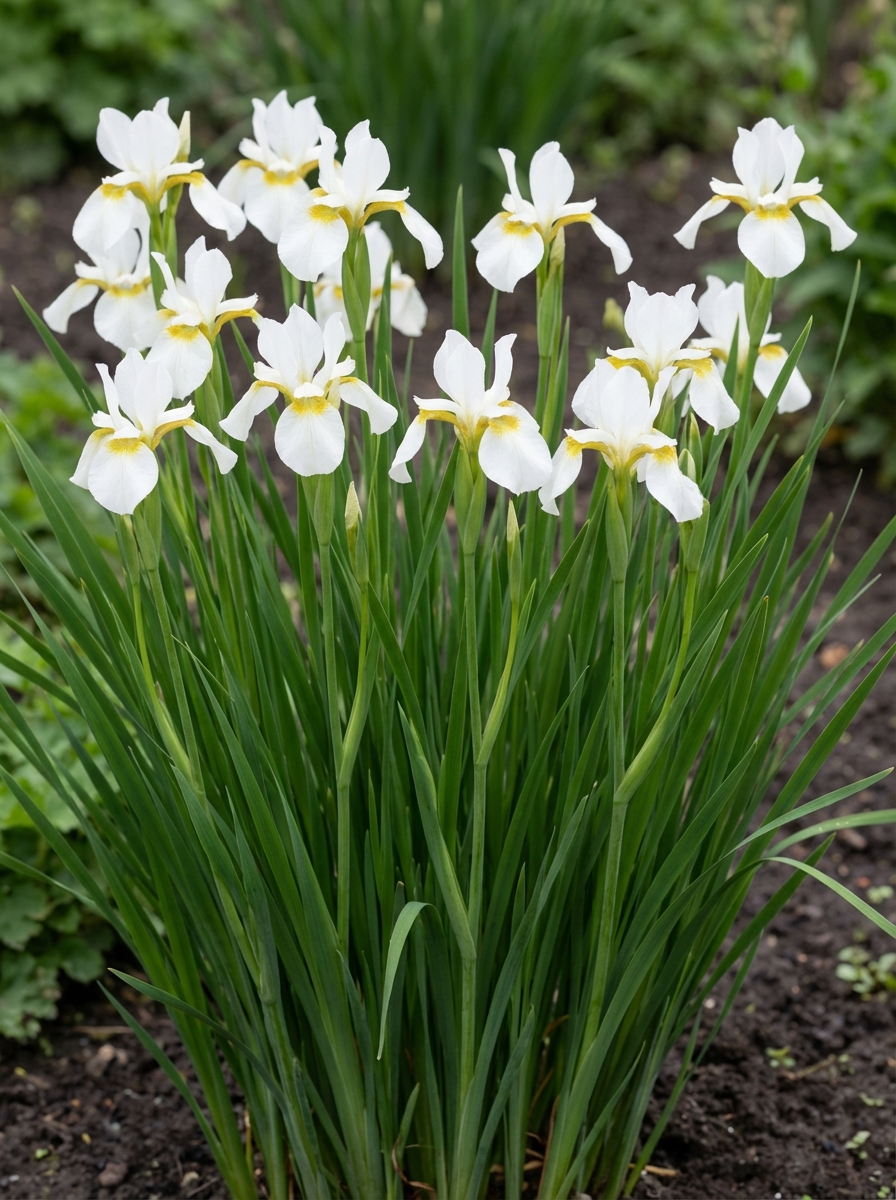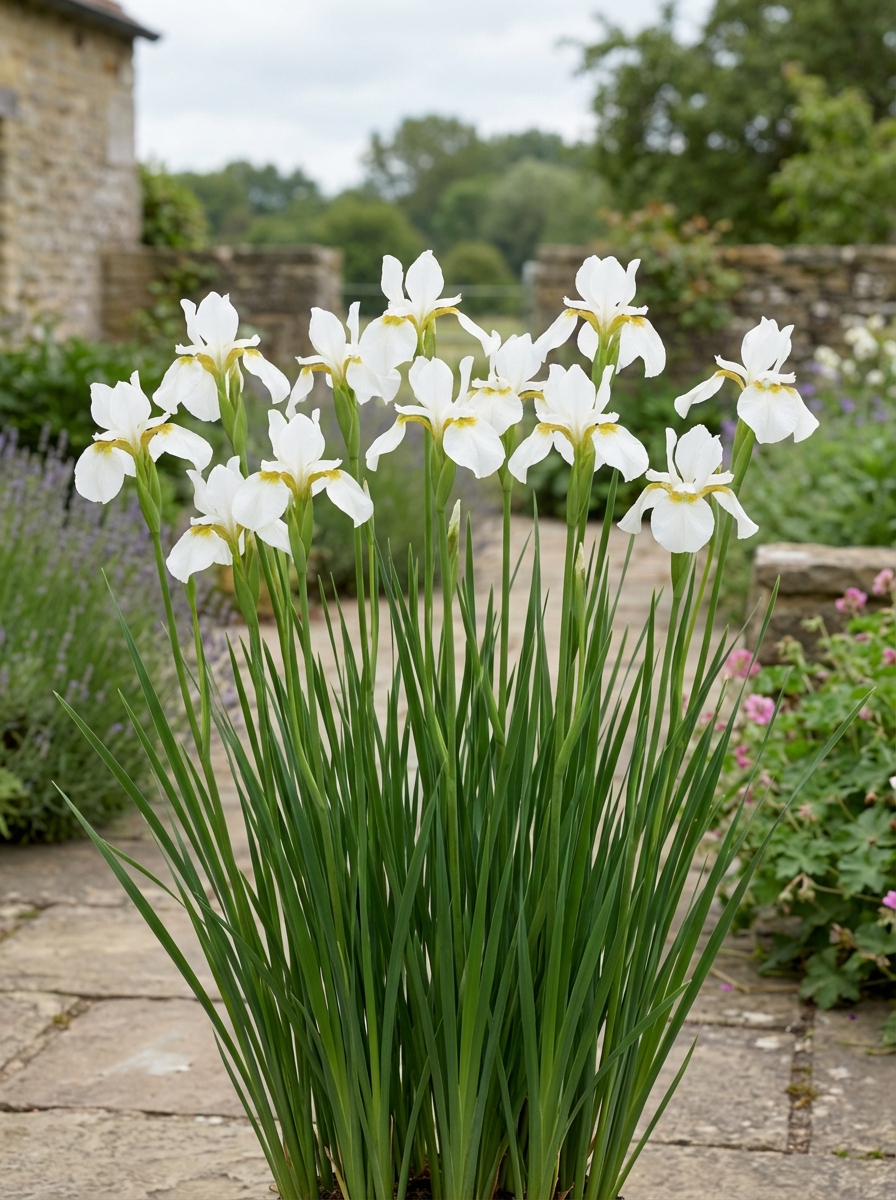 Iris sibirica 'Reine des neiges' avec des feuilles herbeuses bleu-vert qui restent décoratives jusqu’à l’automne.