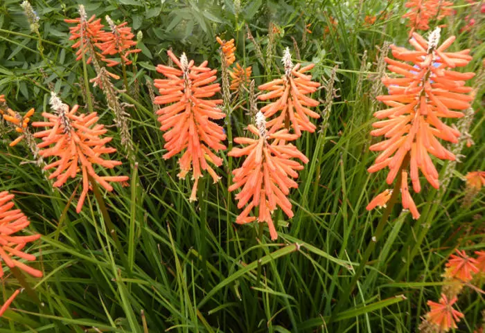 Fleurs sur une longue tige florale nue avec des grappes en forme de pointe, elles fleurissent de haut en bas avec un jaune orangé-rouge à abricot.