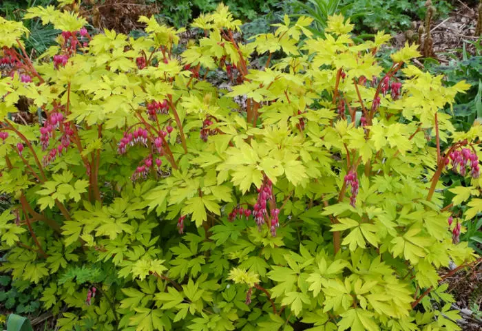 Lamprocapnos spectabilis 'Goldheart' est un cultivar gracieux avec une feuille composée jaune vif et des tiges florales roses surplombantes, avec des fleurs inhabituelles rappelant un cœur. Ils sont rose foncé à l’extérieur et blancs à l’intérieur.