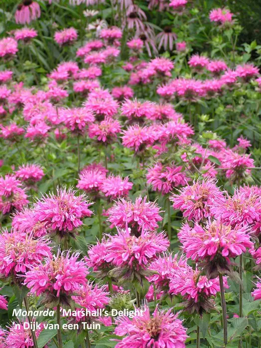Monarda 'Marshall’s Delight' fleurit avec de magnifiques fleurs rose vif avec des bractées violettes