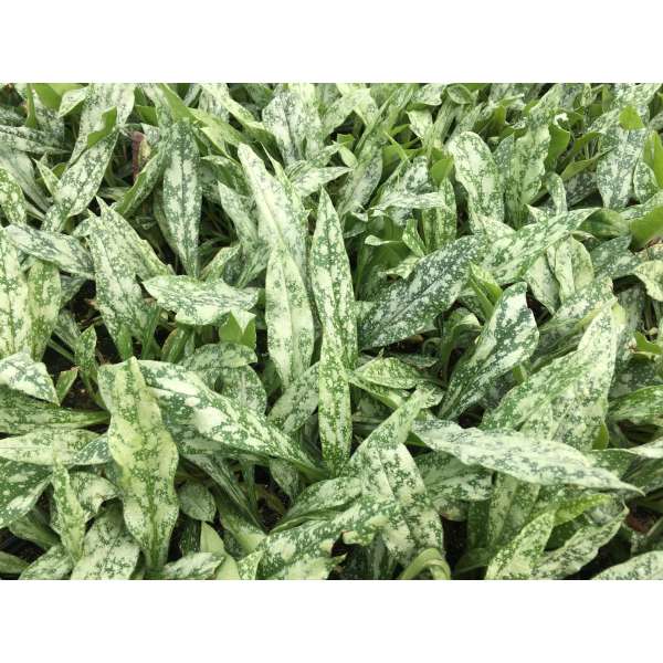 Pulmonaria longifolia subsp. cevennensis a des feuilles plus fines avec de grandes taches irrégulières gris argenté.