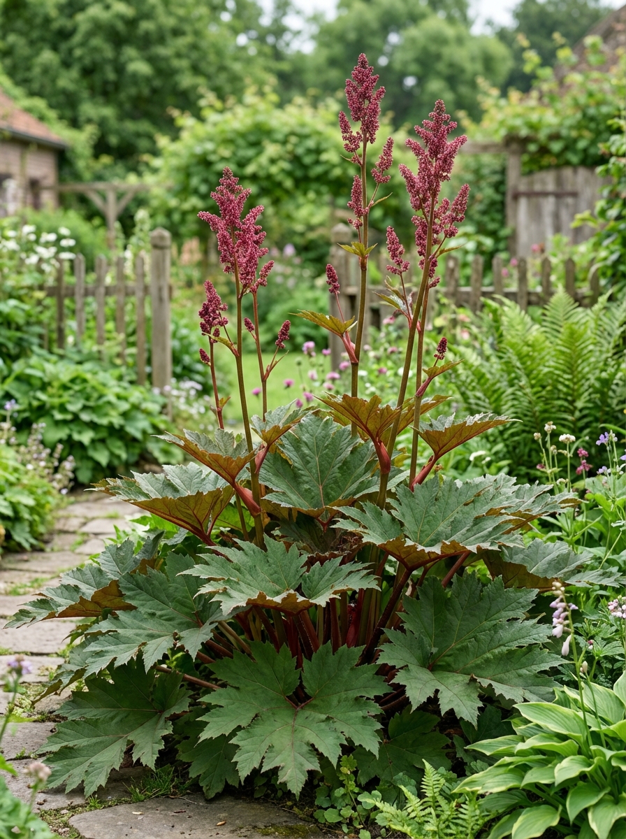Une très grande variété de rhubarbe ornementale de 200 m avec de très grandes feuilles profondément incisées.