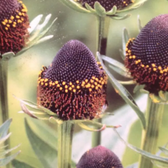 Rudbeckia occidentalis 'Black Beauty' forme des cônes brun-noir avec des étamines jaune doré mais sans pétales. Sous le cône, on voit un tourbillon de sépales verts et étroits.