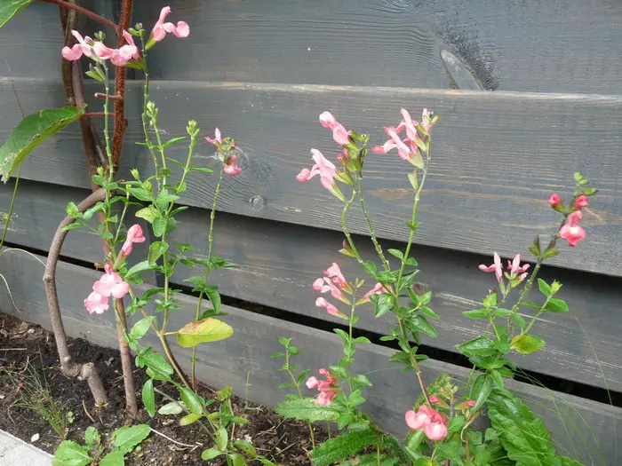 La Salvia x jamensis 'California Sunset' fleurit avec des fleurs orange pêche éclatantes en forme de trompette.