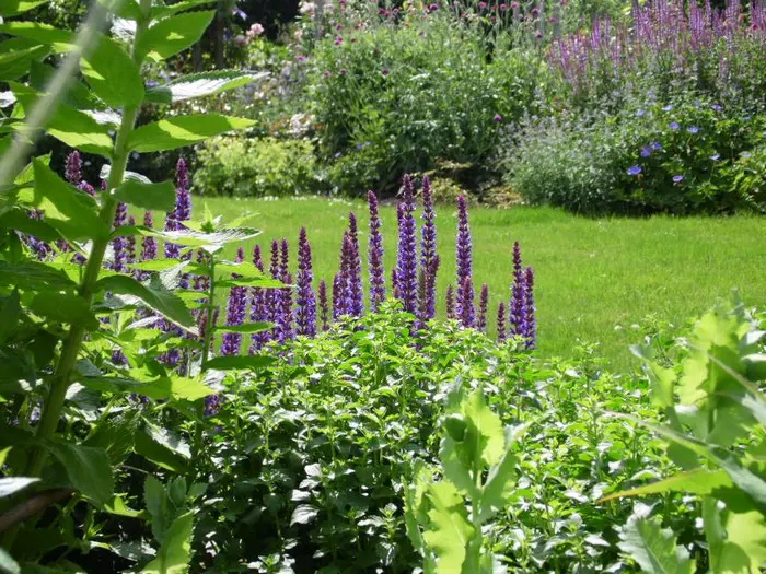 Les fleurs violet-bleu sont massivement en grappes ou en épines sur de longues tiges sombres et poilues.