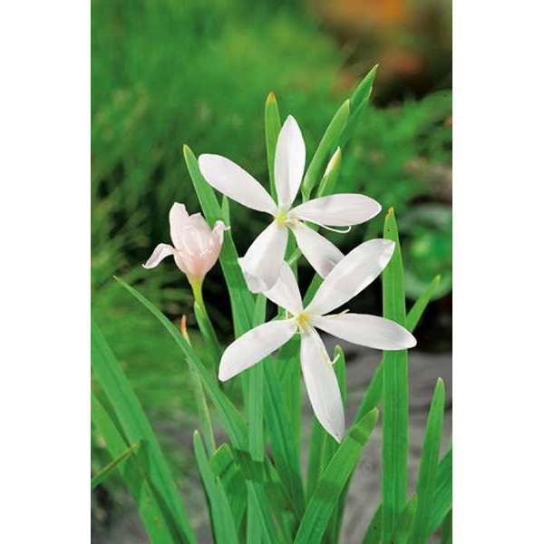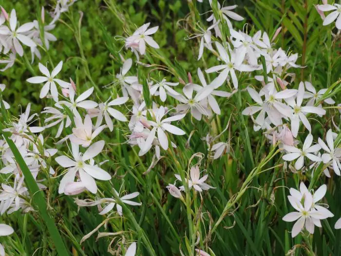 Hesperantha coccinea f. alba est une vivace rhizomée avec des feuilles étroites, en forme d’épée, vert clair et des tiges robustes, avec des fleurs lâches de fleurs blanches pures.