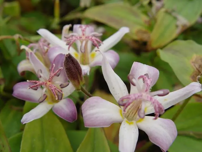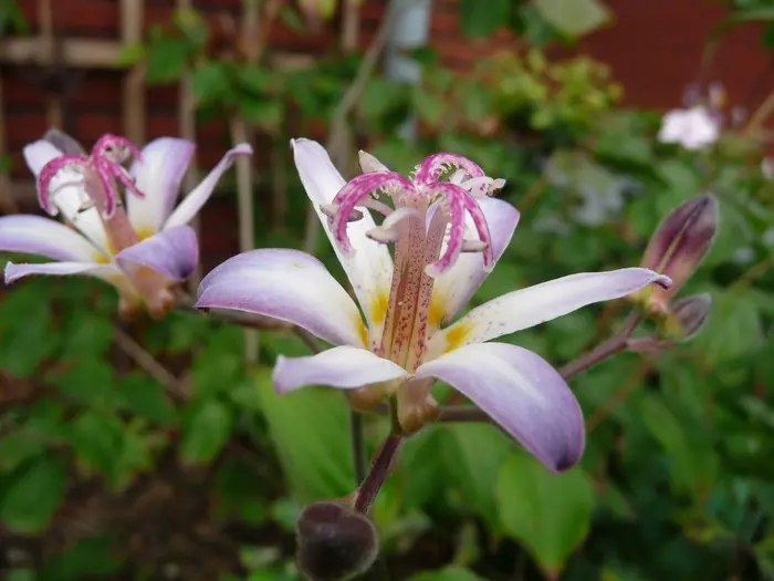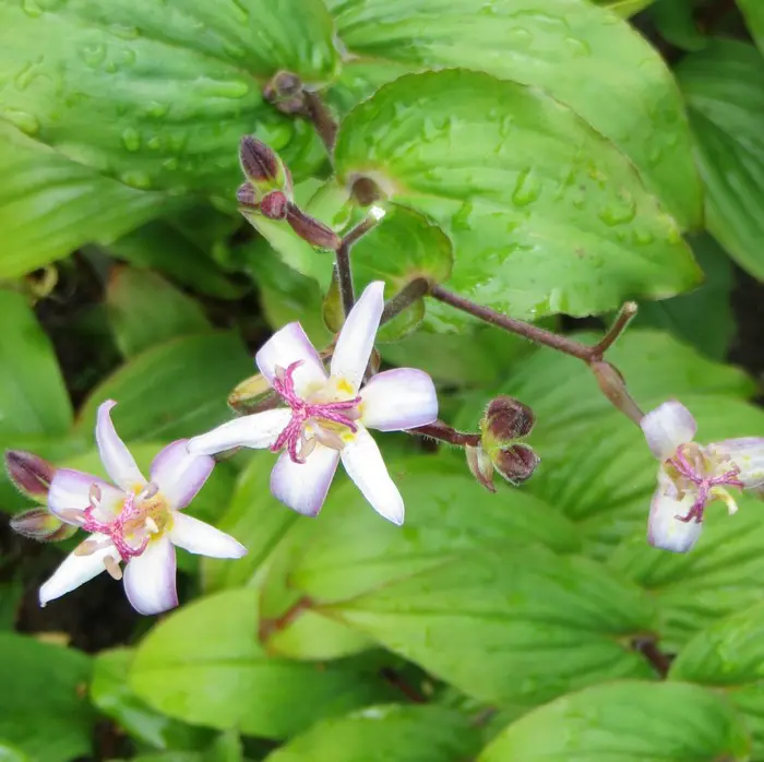 Tricyrtis hirta 'Tojen' fleurit en blanc avec des bords violet-violet-rose.