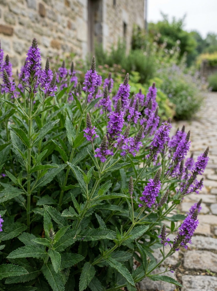 Verbena rigida est une vivace sud-américaine robuste, à longue fleur avec des épines denses de fleurs parfumées allant du violet foncé au lilas. Présente une croissance étendue avec des feuilles sans tige et dentelées.