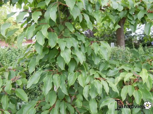 Elle fleurit au printemps avec des fleurs blanches crémeuses au parfum agréable et des anthères jaunes.