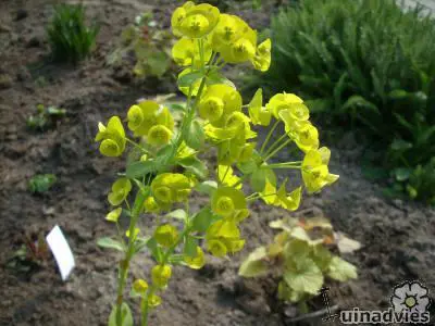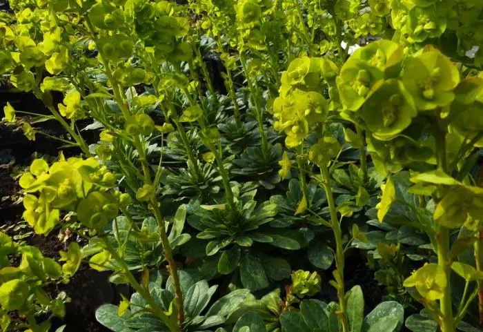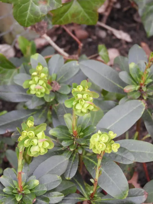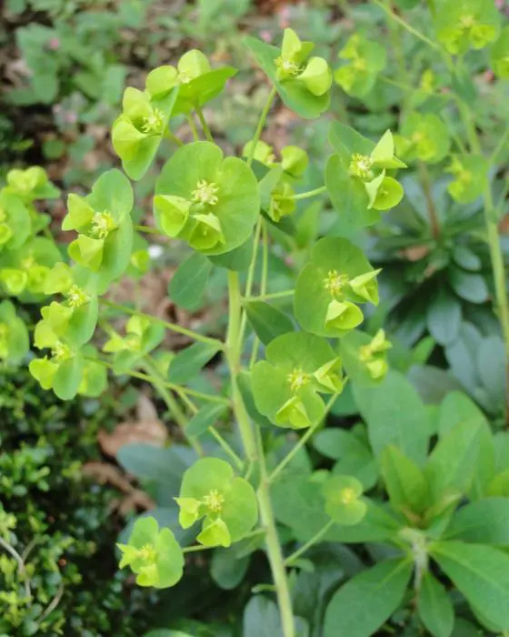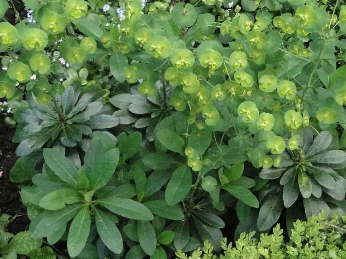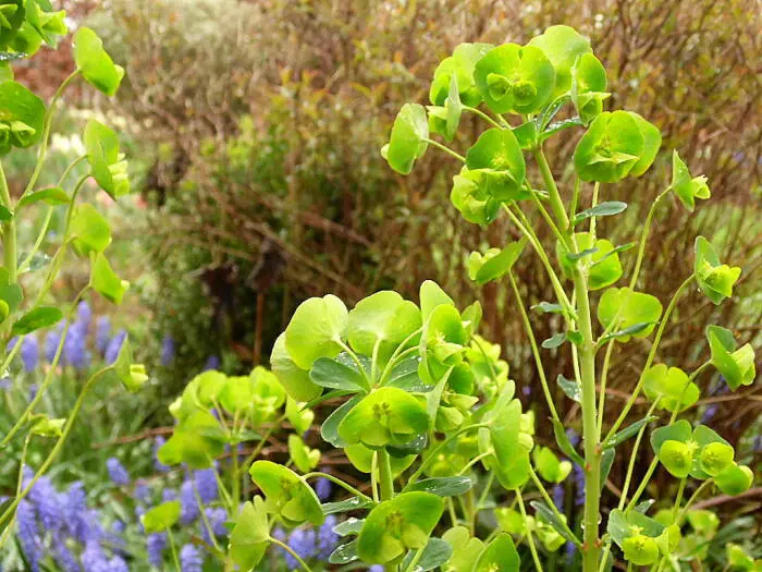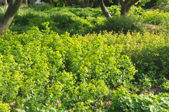Euphorbia amygdaloides var. Robbiae connaît une floraison printanière très rafraîchissante avec des fleurs verdâtres-jaune et des enveloppes vert citron, ce qui ravive les coins sombres.