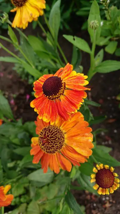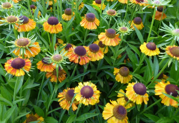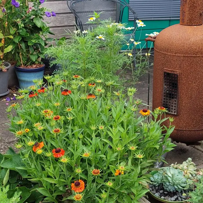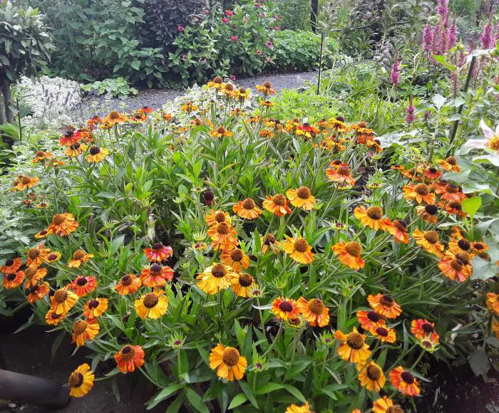 Helenium 'Short’n Sassy' fleurit avec de grandes fleurs d’orange vif et de jaune doré.