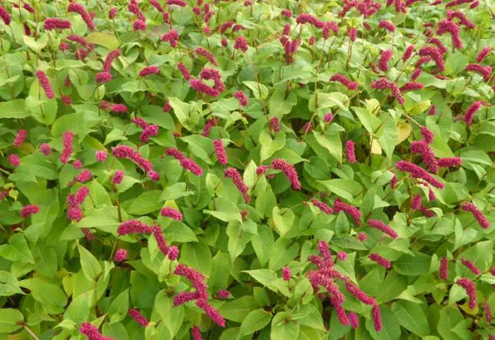Cette renouée fleurit avec des pointes carmin à moitié inclinées.