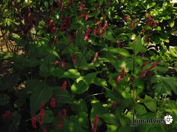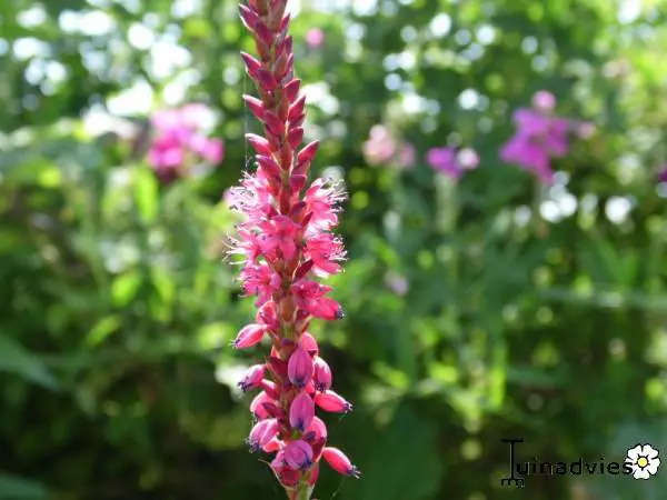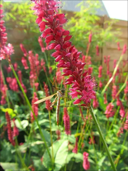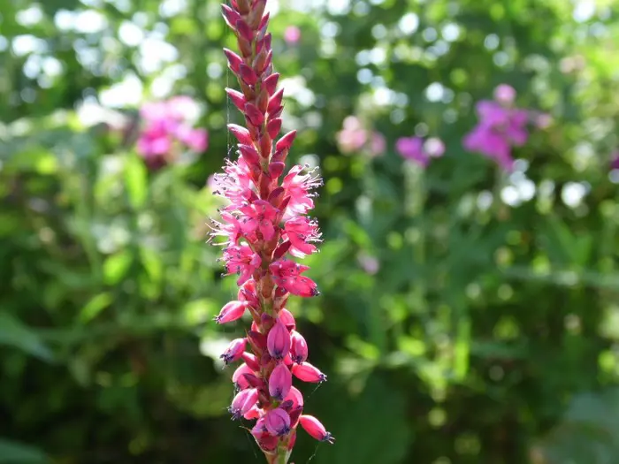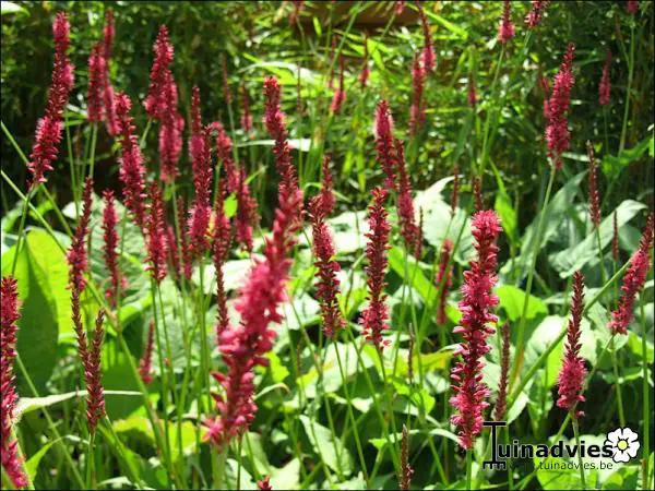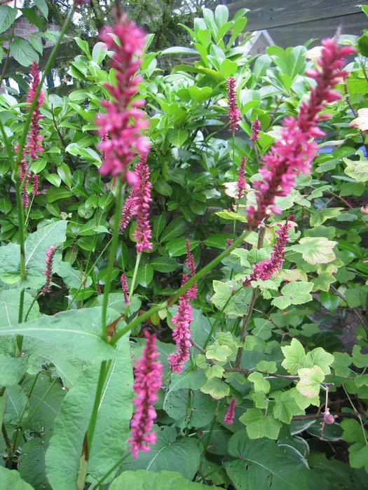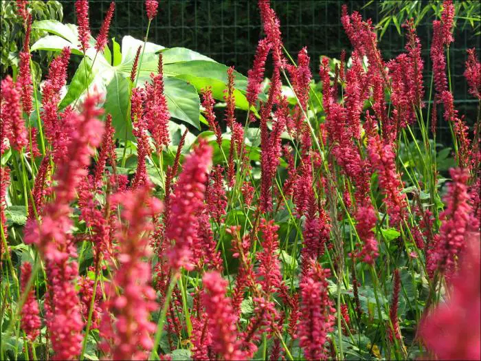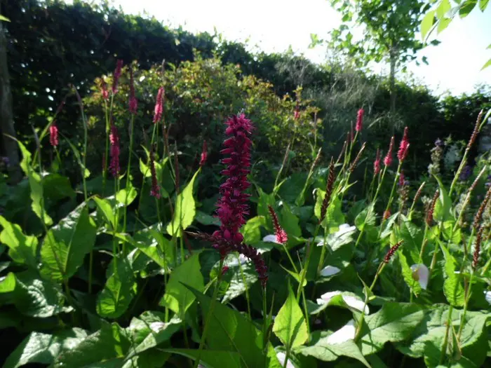 Persicaria amplexicaulis 'Speciosa' est une grande plante touffue avec des épines fleuries rose carmin foncé, particulièrement belles en groupes plus nombreux.