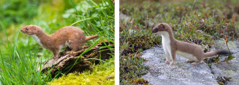 La belette (Mustela erminea) se distingue facilement de la belette par quelques traits marquants. Par exemple, l’hermine a une extrémité de queue noire et les parties du corps ivoire blanc et brun rouille sont plus serrées. De plus, l’hermine est plus grande, jusqu’à 40 cm, et pèse environ 300 grammes. En hiver, l’hermine a un pelage blanc comme neige, seul le bout de la queue restant noir.