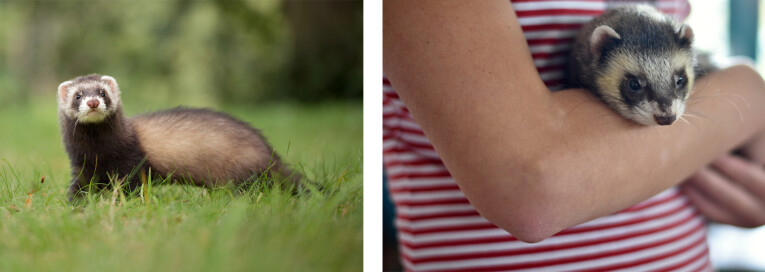 Le furet (Mustela putorius furo) est une sous-espèce entièrement domestiquée du polécat et a peu de chances de survie à l’état sauvage. Les furets sont souvent gardés comme animaux de compagnie ou utilisés pour la chasse. Ils existent en toutes sortes de couleurs, du brun chocolat et noir au blanc vif et au brun clair.