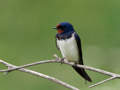 L’hirondelle effraie est immédiatement reconnaissable à son plumage bleu métallique brillant et son ventre crème. Sa gorge et son front deviennent brun-rougeâtre, et des taches blanches courent le long de sa longue queue fourchue. Chez la femelle, les plumes extérieures de la queue sont légèrement plus courtes et ses couleurs sont un peu plus mates.