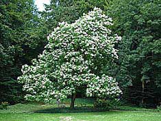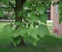 Les feuilles sont opposées ou en volutes en trois parties et très grandes, ovales et avec une base en forme de cœur. Le haut est l’attaquant. Sur le dessous, les feuilles sont doucement velues. Ils commencent à germer à partir d’avril. Lorsqu’on les frotte, ils sentent désagréable. Les fleurs apparaissent en panicules dressées, largement coniques, hermaphrodites. Ils mesurent de 3 à 5 cm de taille. La couleur est blanche, l’intérieur rayé de jaune et tacheté de violet. Elles ont une odeur légère et ressemblent à des orchidées. Le pistile est de couleur brune. Les fruits sont des gousses à paroi fine avec de petites graines pointues et des ailes poilues. Ils restent sur l’arbre jusqu’au printemps. L’écorce est gris-brun.