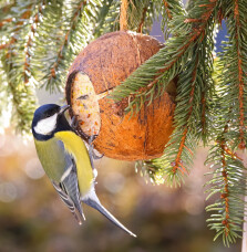 • Nos animaux ailés ailes aiment se régaler des mélanges gras et de graines transformés dans des demi-noix de coco. Les oiseaux peuvent bien s’accrocher à la demi-noix de coco en mangeant et ils aiment aussi utiliser les fibres de coco comme matière de nidification.