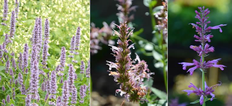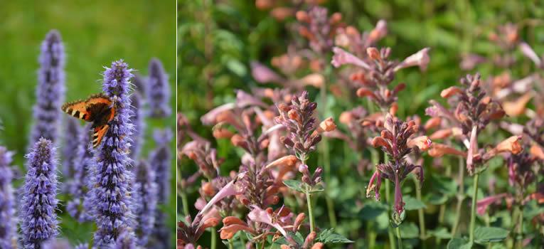 Les blancs du chou adorent l’Agastache, et toutes sortes de petits papillons comme les yeux de sable, les bleus, ... jusqu’au papillon de nuit colibri. Laissez de l’espace aux plantes ; Ce sont des baigneurs de soleil qui ont besoin de lumière. Plus il y a de soleil, plus il y a de fleurs ; Le soleil de l’après-midi est meilleur que celui du matin. Lorsqu’elles sont trop comprimées entre d’autres plantes, elles se fanent. Si votre Agastache pousse trop haut, appliquez la Chelsea chop à la mi-mai : coupez un tiers à la moitié des tiges à moitié. Vous aurez des fleurs plus tard, mais plus encore, et en une grappe plus fournie, et les tiges ne s’ouvriront plus. Couvrez les jeunes plants en plein air à -7 °C avec une couche de feuilles ou de paille. Dès que le gel est passé, retirez à nouveau le couvercle, sinon la rosette foliaire pourrit. La plupart des Agastaches sont des plantes à vie courte, durant trois à cinq ans. Parfois, la plante semble avoir disparu, mais il faut juste un peu plus de temps avant qu’elle commence à germer. Après un hiver froid, il se trouve que l’Agastache mexicana, par exemple, ne donne aucun signe de vie avant le début du mois de mai. En revanche, il y a une très longue floraison, de juin à septembre, voire bien en octobre.