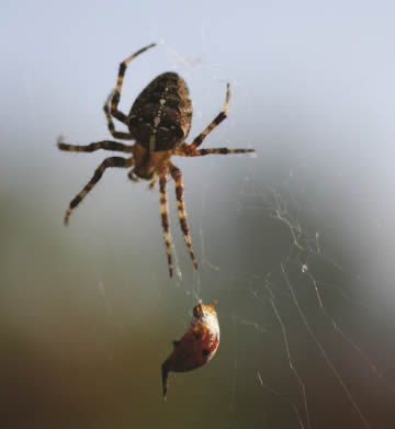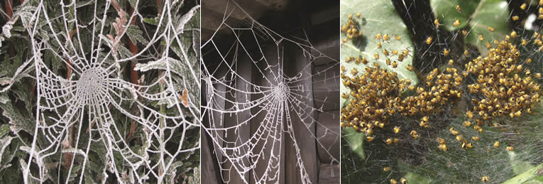 Malgré de nombreuses tentatives, l’homme n’a pas encore réussi à imiter ce fil. En automne, de nombreuses haies, murs et plantes sont ornés de véritables œuvres d’art. La toile d’orbe, une toile en forme de roue, est un véritable chef-d’œuvre d’araignée adulte mais ce n’est pas un art innocent de l’araignée, c’est un piège très efficace et mortel. Dès qu’un visiteur involontaire touche un fil de la toile, le bâtisseur ressent les vibrations et sort de sa cachette pour vaincre la proie. Une toile en forme d’entonnoir, de hamac ou de tunnel est également courante dans le jardin.
