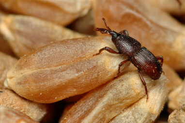 Le charançon (Sitophilus granarius), également appelé ver des maïs , est un charançon mesurant environ 3 à 5 mm de taille. Malgré son apparence mignonne, il est conseillé de chercher la source dès que possible si vous en trouvez une chez vous. Il affecte les réserves alimentaires et se trouve dans les graines des plantes. La femelle pond ses œufs dans un grain de blé. La larve mange ensuite le grain vide et se nymphose dans la coque. Le charançon des céréales est un parasite redouté, surtout pour les agriculteurs. Ce charançon peut aussi se retrouver dans nos maisons ou dans nos entrepôts à cause de nourriture infestée pour chiens ou poules, ou de graines pour oiseaux. Les stocks de pâtes et de pois sont également une source potentielle de dommages.