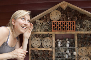 Dans de nombreux jardins, des hôtels dits à insectes ou abeilles apparaissent , parfois plusieurs spécimens de formes, tailles et couleurs différentes. Souvent, ils sont achetés ou assemblés seuls et l’un est plus efficace que l’autre. Nous voulons surtout aider les abeilles à ce niveau, mais en même temps ces bâtiments peuvent être assez décoratifs et égayer un mur de jardin nu. Quoi qu’il en soit, elles sont très populaires et aident les abeilles solitaires à se reproduire. Dans un hôtel bien meublé, différents types se font rapidement en place. Les premiers visiteurs sont souvent des abeilles maçonnes à cornes et rouges qui laissent leurs œufs dans des tubes en bambou ou en carton, des tunnels dans des briques ou des ouvertures dans des blocs de bois. Les pièces prévues pour d’autres insectes tels que les papillons, les chrysopes ou les coccinelles sont principalement utilisées comme quartiers de couchage ou pour se protéger par mauvais temps. Dans ce dernier cas, les abeilles osent souvent se cacher dans une fleur en prévision d’un moment ensoleillé.