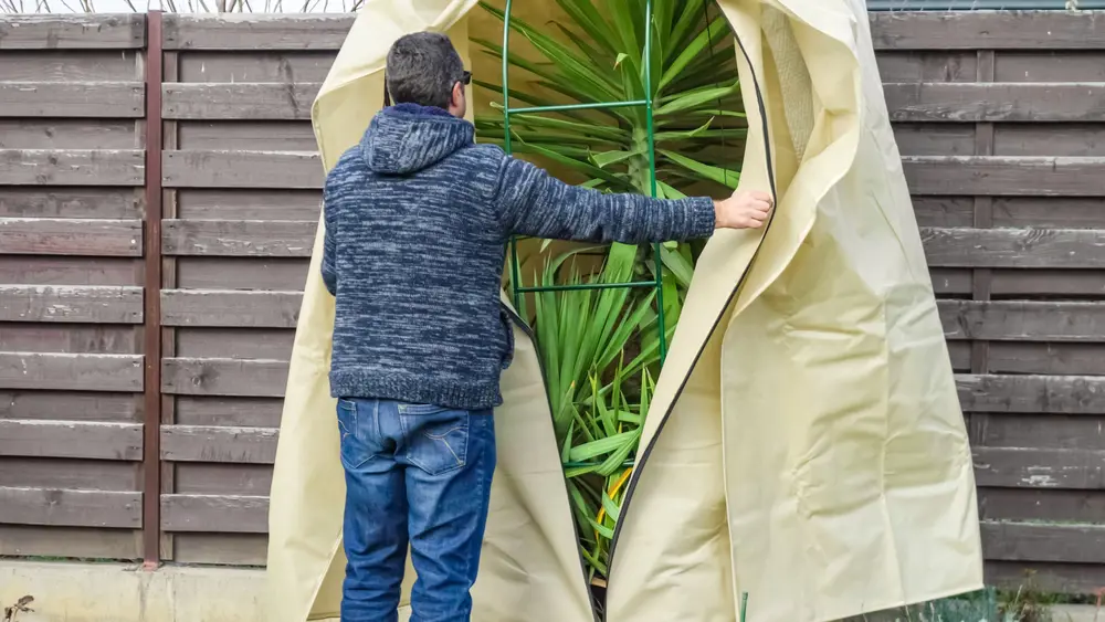 Een effectieve beschermingsmethode is het omwikkelen van de stam met een warmtekabel, in combinatie met een vorsthoes, vliesdoek, jute of rietmatten. Nadat de bladeren zijn samengebonden, is het vervolgens de beurt aan de stam om deze te ontwikkelen. Als extra isolatie kun je tussen de doeken stro aanbrengen.